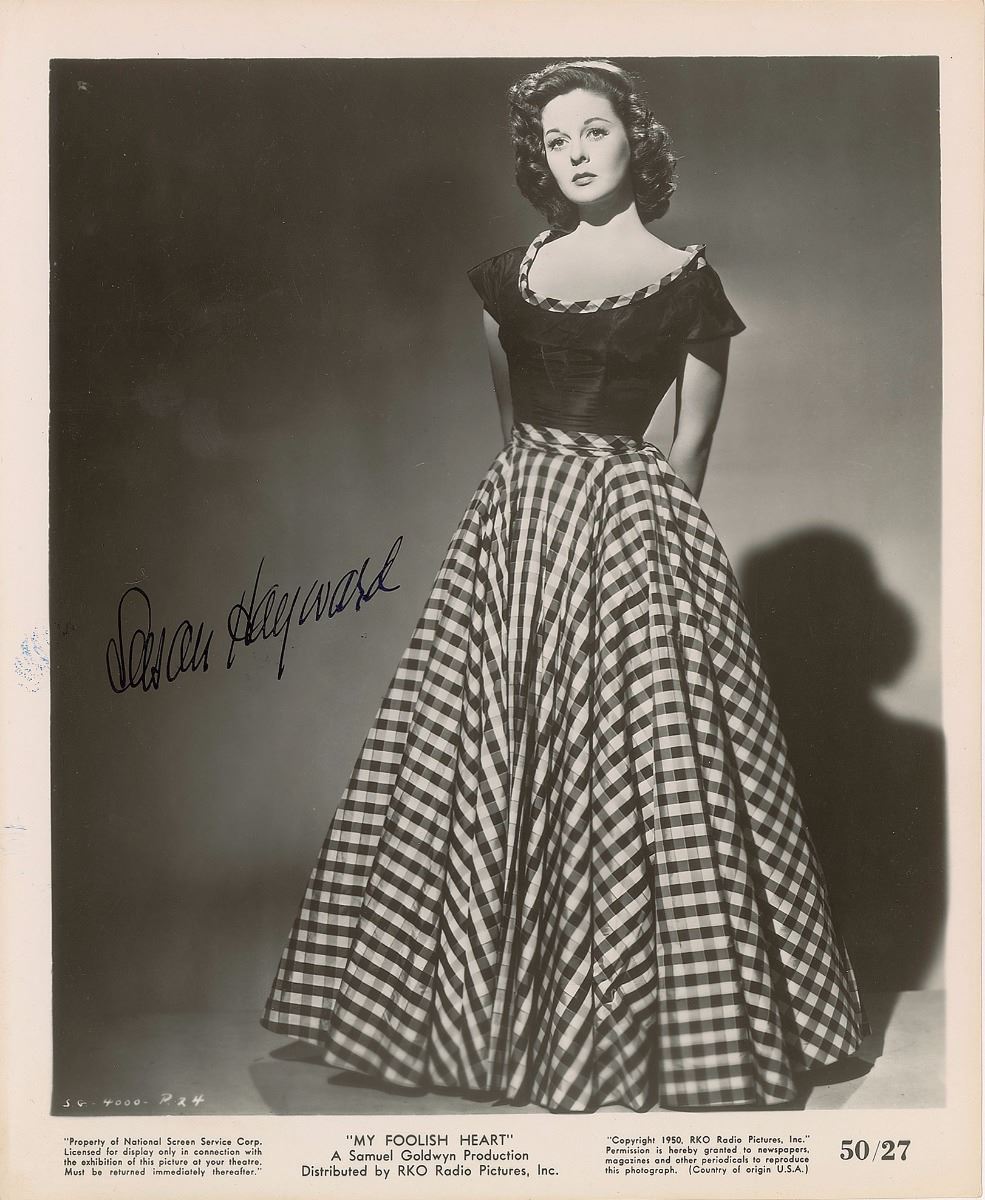 Attractive vintage glossy 8 x 10 RKO promotional photo for My Foolish Heart showing Hayward in a checkered dress, signed on the left side in fountain pen. In fine condition, with a light stray ink mark to the left border.