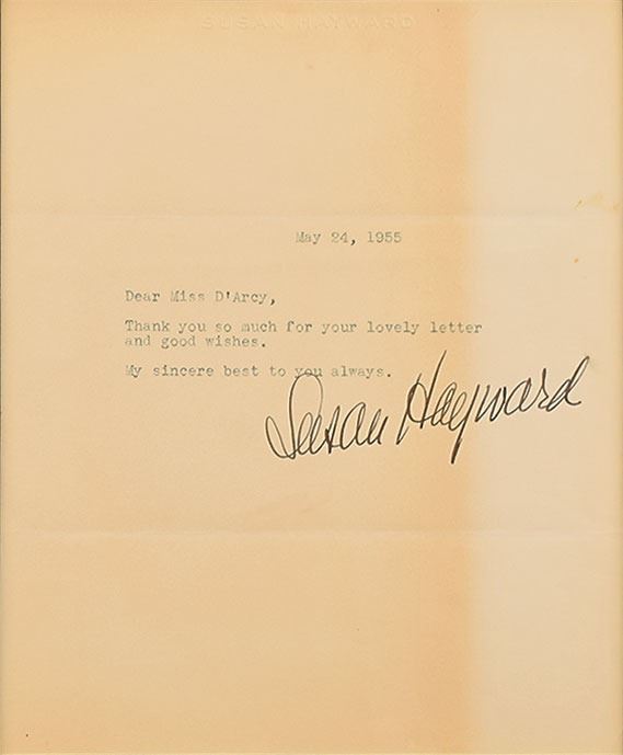 TLS, 7 x 8.5, personal letterhead, May 24, 1955. Brief letter to Miss D'Arcy, in full: "Thank you so much for your lovely letter and good wishes. My sincere best to you always." Matted with a lovely portrait of Hayward to an overall size of 17.25 x 11.5. In very good to fine condition, with a block of toning over much of the letter.