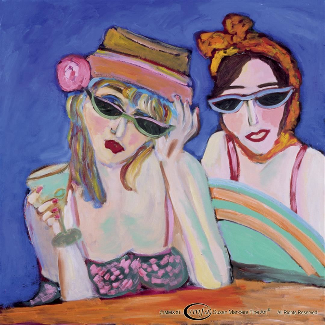 Susan Manders "BFFs" is a 36x36" original oil on canvas. Wine and wisdom will bring these friends closer . Susan Manders was only the 2nd Woman selected as a US Olympic artist in 2004. Manders works are represented in fine collections internationally & archived by the National Museum of Women in the Arts ,Washington, DC. As the 2nd woman to be selected a US Olympic Artist, Manders joins an exclusive club of internationally acclaimed artists.