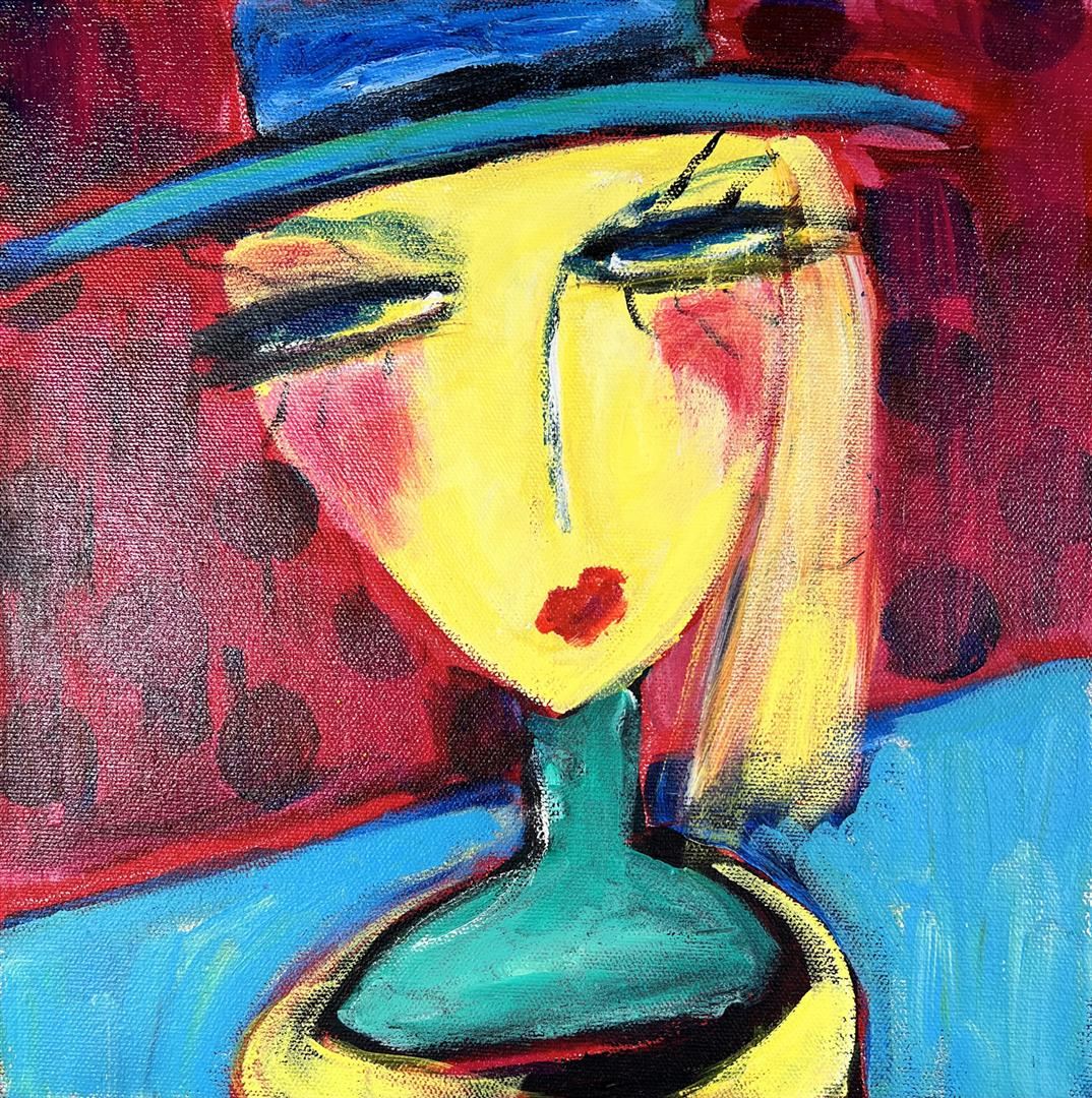 Susan Manders "Bored in Blue Hat" is a 12by12 original oil on canvas