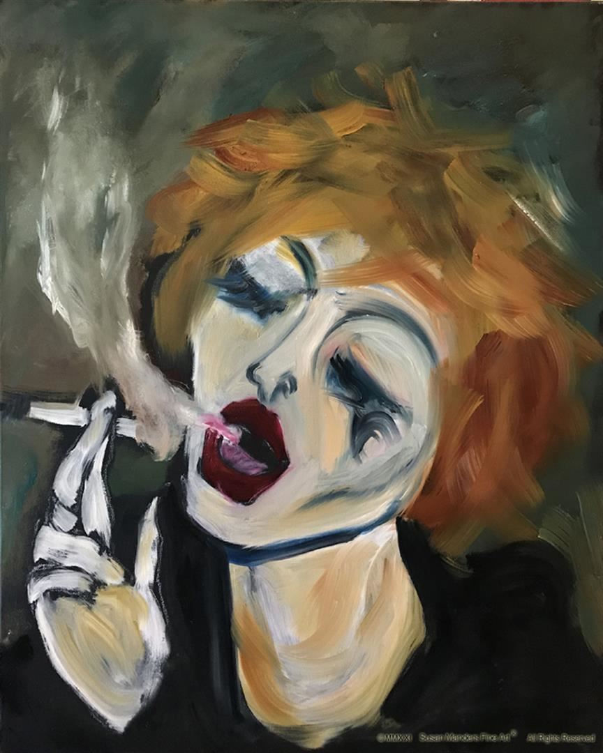 Every smoker knows why they love this moment. Susan Manders "Burnin"" is a 36 x 24" original oil on canvas. Manders works are represented in fine collections internationally & archived by the National Museum of Women in the Arts ,Washington, DC. As the 2nd woman to be selected a US Olympic Artist, Manders joins an exclusive club of internationally acclaimed artists.
