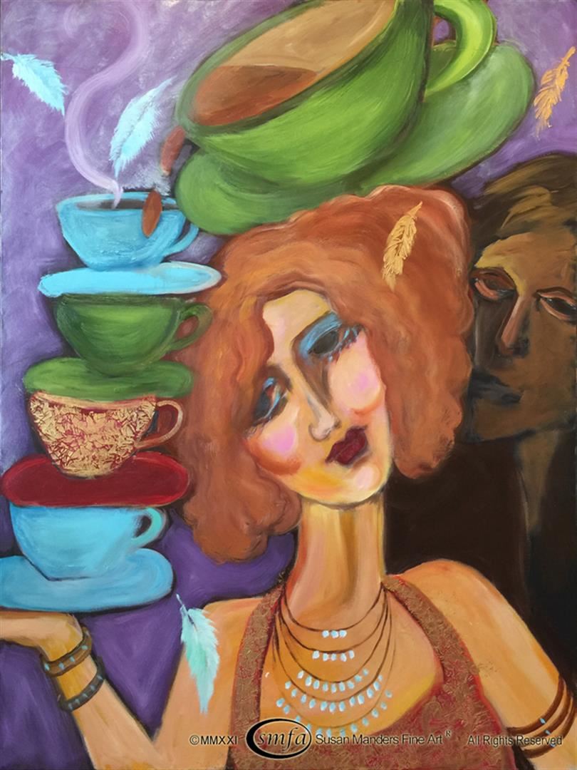 Susan Manders "Coffee Romance" is a 36x48" original oil on canvas. Love that java , so keep it coming. Susan Manders was only the 2nd Woman selected as a US Olympic artist in 2004. Manders works are represented in fine collections internationally & archived by the National Museum of Women in the Arts ,Washington, DC. As the 2nd woman to be selected a US Olympic Artist, Manders joins an exclusive club of internationally acclaimed artists.