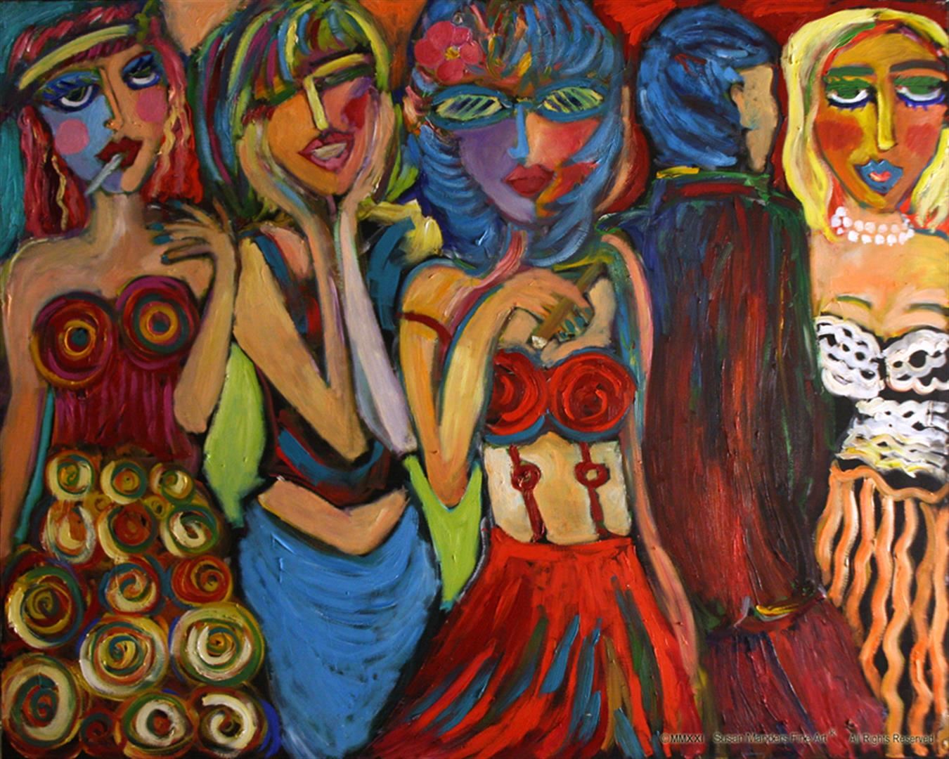These girls just want to have fun in Susan Manders "Disorderly Dames" is a 60 x 48 original oil on canvas. Manders works are represented in fine collections internationally & archived by the National Museum of Women in the Arts ,Washington, DC. As the 2nd woman to be selected a US Olympic Artist, Manders joins an exclusive club of internationally acclaimed artists.