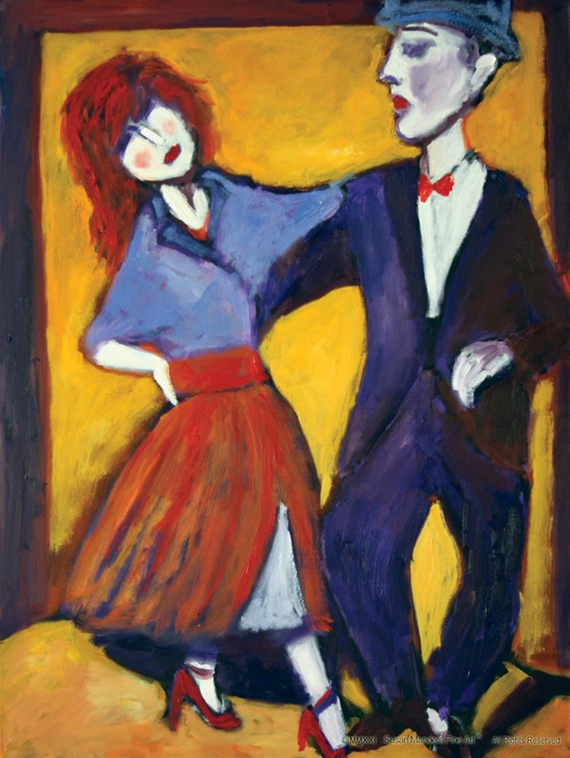 Swing in style, with Susan Manders "Jitter Bug". A 30 x 40" original oil on canvas. Manders works are represented in fine collections internationally & archived by the National Museum of Women in the Arts ,Washington, DC. As the 2nd woman to be selected a US Olympic Artist, Manders joins an exclusive club of internationally acclaimed artists.