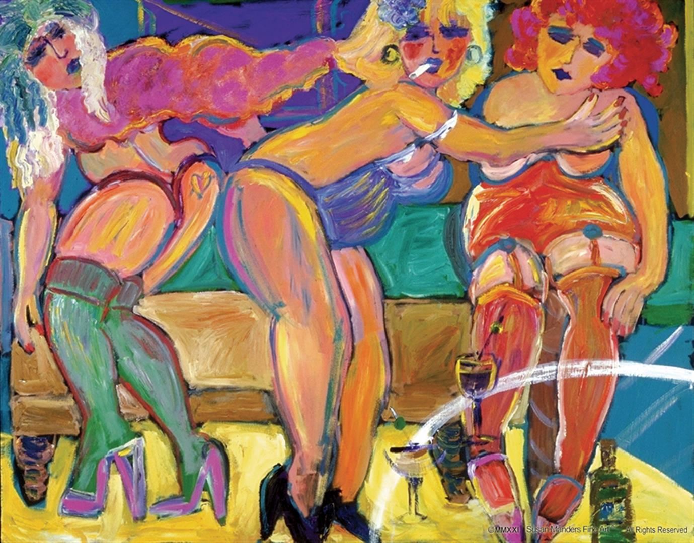 Susan Manders Original "Cover-Up". This piece is 60 x 48 original oil on canvas. Manders works are represented in fine collections internationally & archived by the National Museum of Women in the Arts ,Washington, DC. As the 2nd woman to be selected a US Olympic Artist, Manders joins an exclusive club of internationally acclaimed artists.