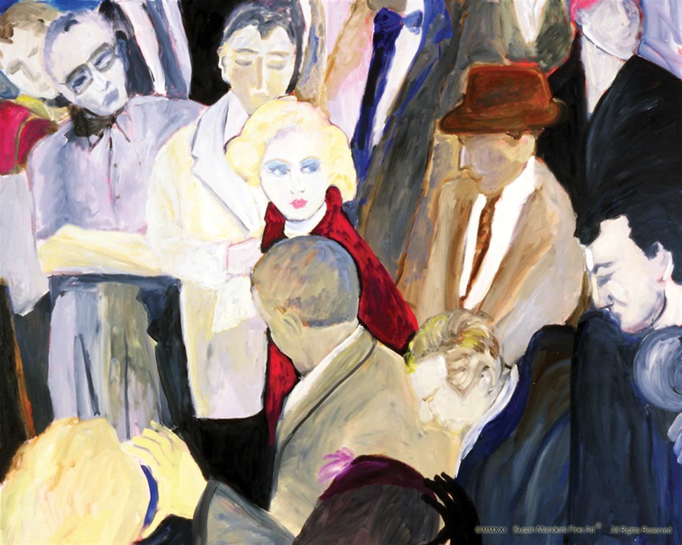 Standing out in a crowd says Susan Manders Original "Crowd Sourcing", A 60 x 48" original oil on canvas. Manders works are represented in fine collections internationally & archived by the National Museum of Women in the Arts ,Washington, DC. As the 2nd woman to be selected a US Olympic Artist, Manders joins an exclusive club of internationally acclaimed artists.
