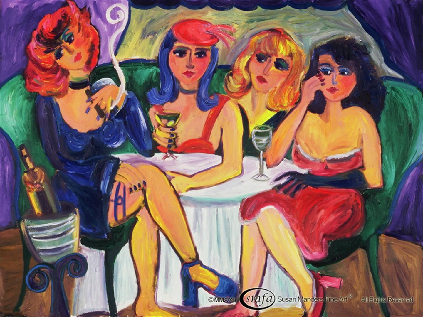 Susan Manders Original "Universe is my Oyster" is a 48x36" original oil on canvas. It's Girls on patrol . Now where is Mr.Right? Susan Manders Original was only the 2nd Woman selected as a US Olympic artist in 2004. Manders works are represented in fine collections internationally & archived by the National Museum of Women in the Arts ,Washington, DC. As the 2nd woman to be selected a US Olympic Artist, Manders joins an exclusive club of internationally acclaimed artists.
