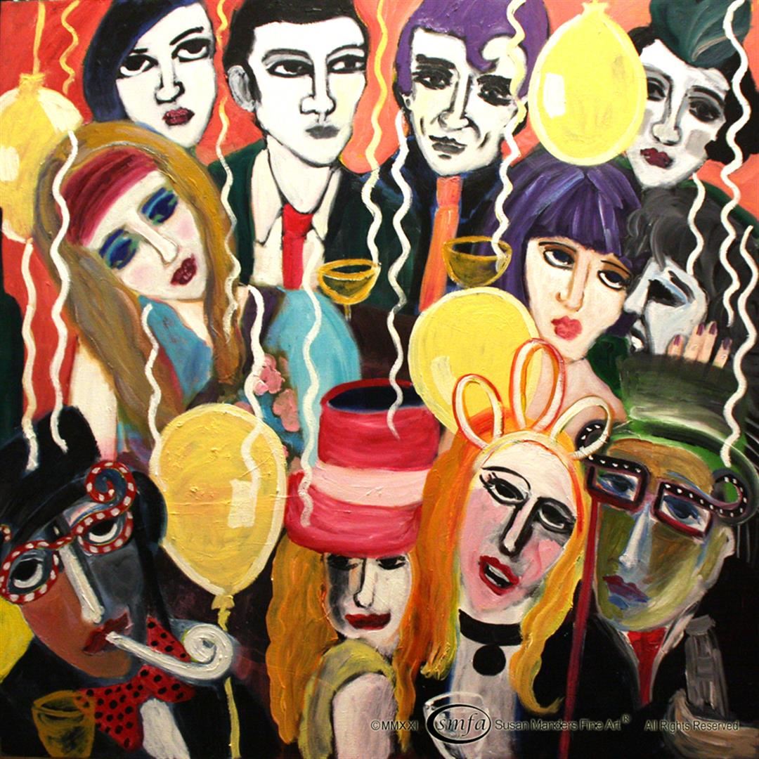 Susan Manders "Party On" is a 48by48" original oil on canvas