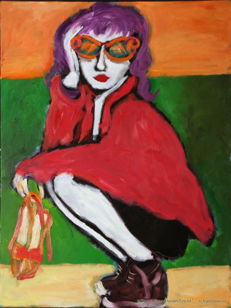 She's ready now after a quick change in Susan Manders "Running Shoes". A 30 x 40" original oil on canvas. Manders works are represented in fine collections internationally & archived by the National Museum of Women in the Arts ,Washington, DC. As the 2nd woman to be selected a US Olympic Artist, Manders joins an exclusive club of internationally acclaimed artists.