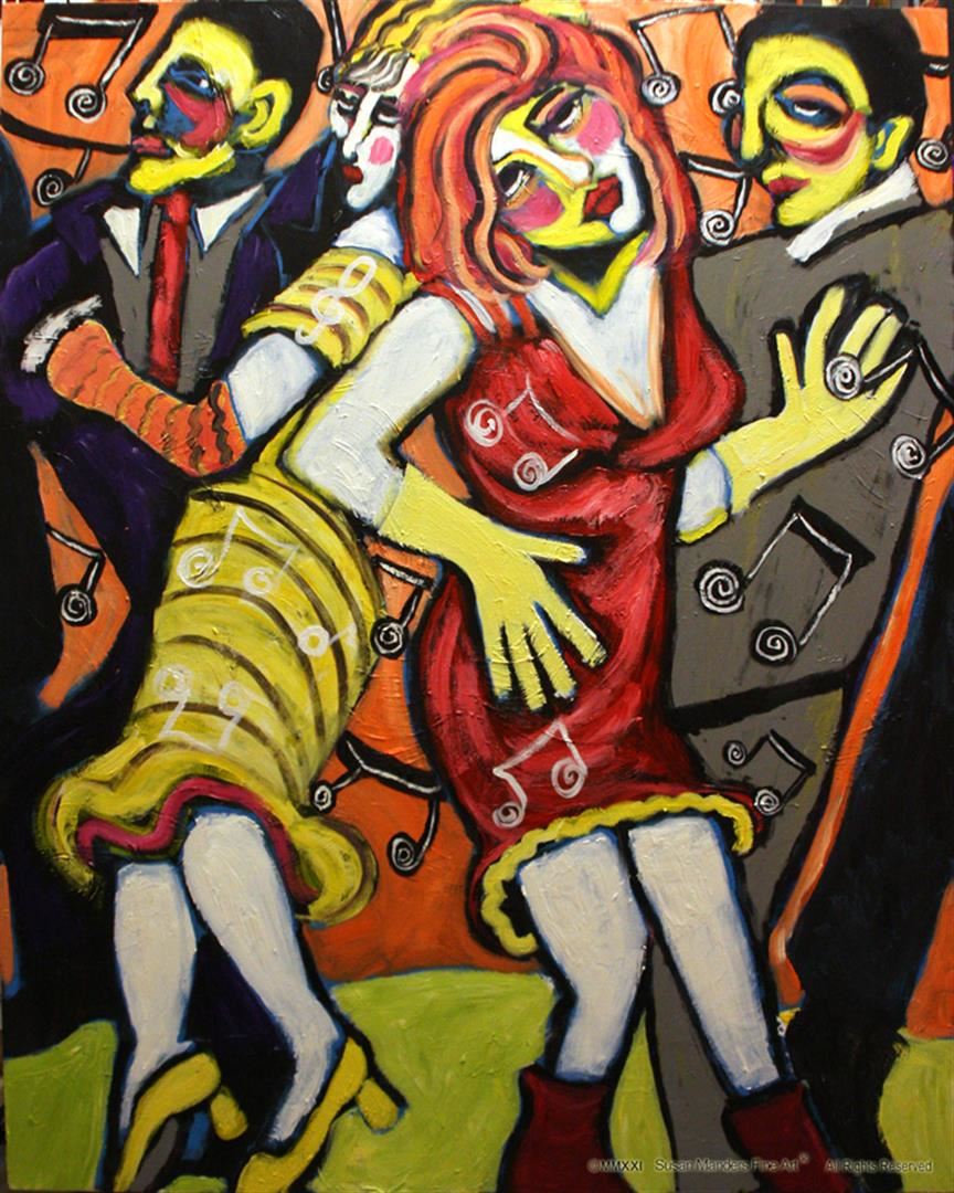 Feel the music and dance in Susan Manders "Salsa" is a 48 x 60" original oil on canvas. Manders works are represented in fine collections internationally & archived by the National Museum of Women in the Arts ,Washington, DC. As the 2nd woman to be selected a US Olympic Artist, Manders joins an exclusive club of internationally acclaimed artists.