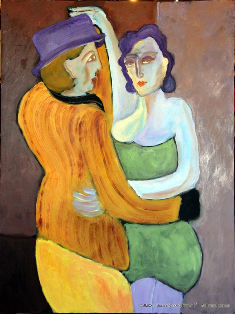 Learning his dance moves in Susan Manders "Turning". A 30 x 40" original oil on canvas. Manders works are represented in fine collections internationally & archived by the National Museum of Women in the Arts ,Washington, DC. As the 2nd woman to be selected a US Olympic Artist, Manders joins an exclusive club of internationally acclaimed artists.