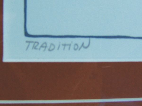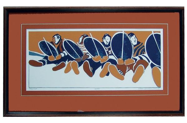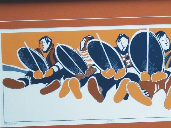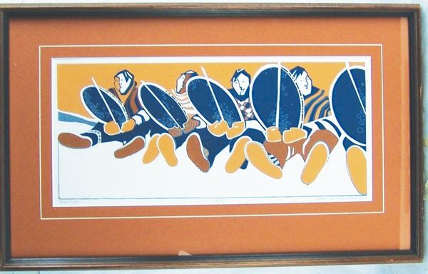 Fine, signed, limited edition (#15/150) four-color silkscreen print showing a group of Eskimo singers/drummers, titled "Tradition." Very good condition, matted and framed.Ca. 19819" x 19" (16" x 26")