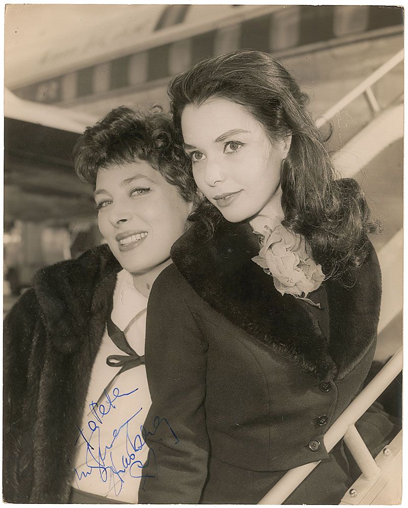 Vintage pearl-finish 8 x 10 photo of Strasberg arriving in London with Rita Gam, signed and inscribed in fountain pen, “To Pete, from Susan Strasberg.” Reverse bears the original affixed press caption. In fine condition, with slight brushing to the inscription and signature.