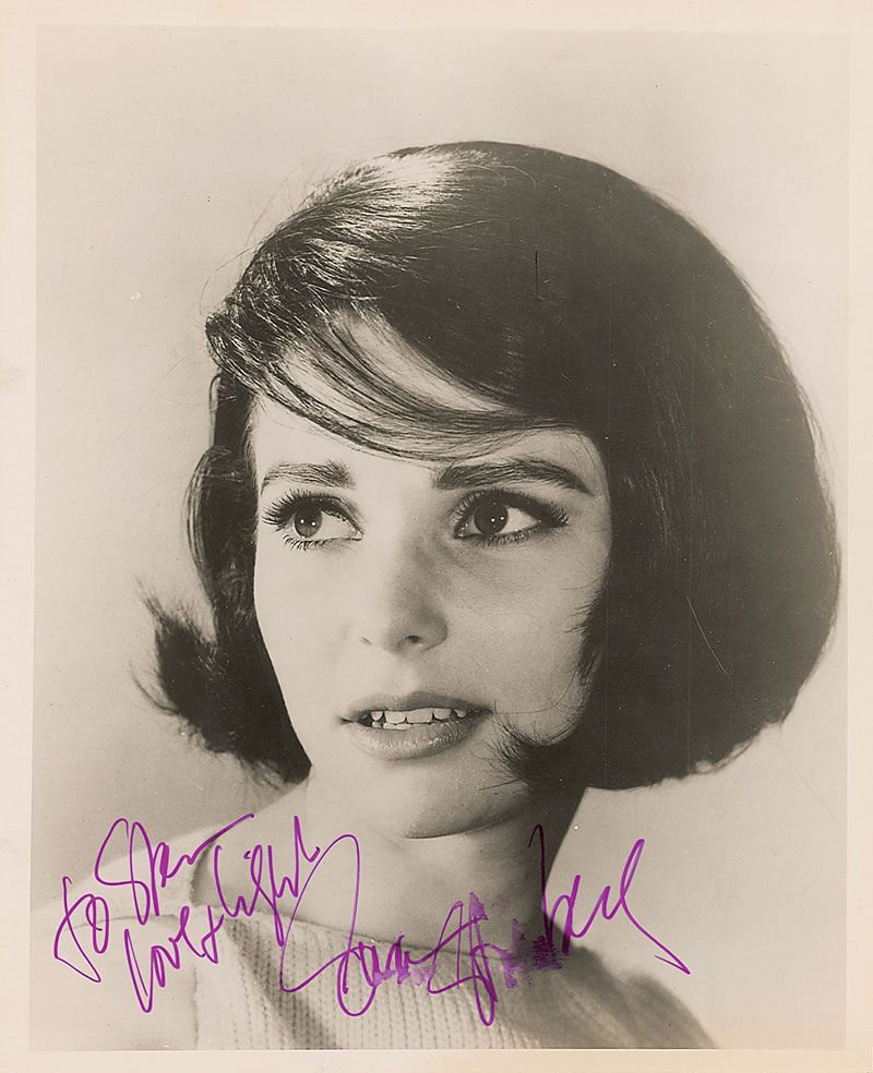 Glossy 8 x 10 photo, signed and inscribed in purple felt tip, “To Steve, love & light, Susan Strasberg.” In fine condition, with a few light brushes and spots to signature.