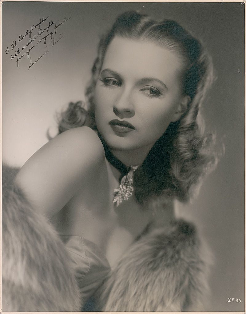 Vintage matte-finish 10.5 x 13.5 photo of Foster in a fur stole, signed and inscribed in fountain pen “To Lt. Dorothy Coughlan, with sweetest thoughts from your singing friend, Susanna Foster.” Tack holes and creases to top corners and edge, signature a shade lighter than inscription, and scattered silvering to darker areas of image, otherwise fine condition.