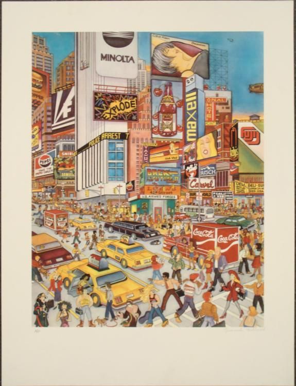 Artist: Susannah MacDonald Title: Times Square * Paper Size: 25 3/8 x 19 3/4 inches. Notes: Signed ed. 375 < Biography/ul>Susannah MacDonald began her artistic career as a clothing designer and illustrator. By the early 1990's, she developed a unique method of printmaking, combining silk-screen and lithography on paper and transparent sheets of mylar. This distinctive style, in her scenes of contemporary life gain national attention at the New York Artexpo in 1995. Since then, she has been a popular, and well loved artist.