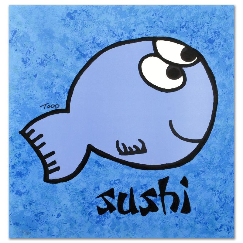 Pop artist Todd Goldman is known all across the globe for his whip-smart and wickedly funny puns and pictures! "Sushi" is a limited edition lithograph on paper, numbered and hand signed by Todd. Includes Certificate of Authenticity! Measures approx. 21.5" x 22" (no border).
