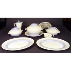 Susie Cooper blue and grey banded part dinner service comprised tureens, oval meat plats, dinner plates etc and a star patterned Susie Cooper hot water pot