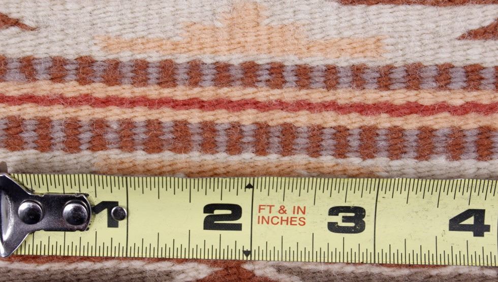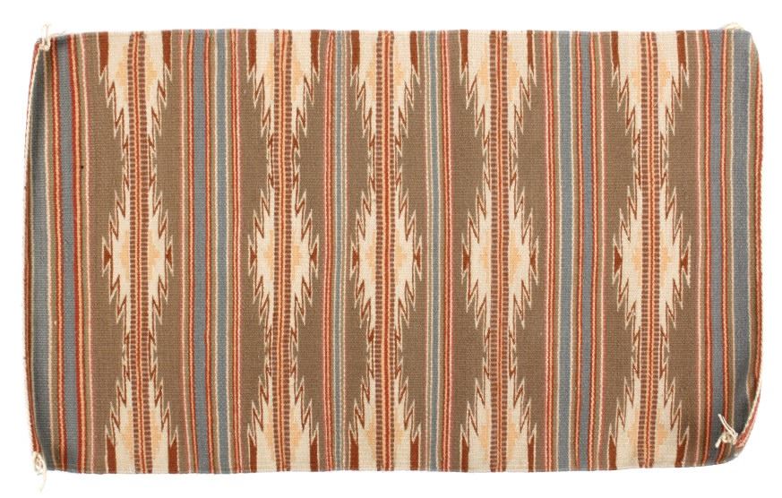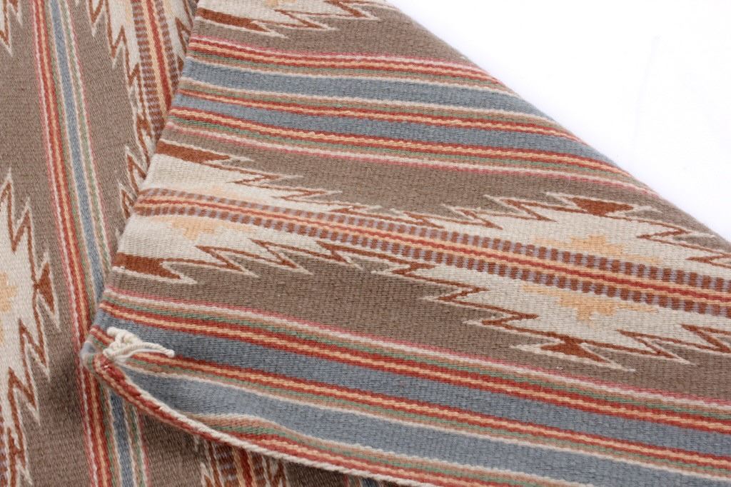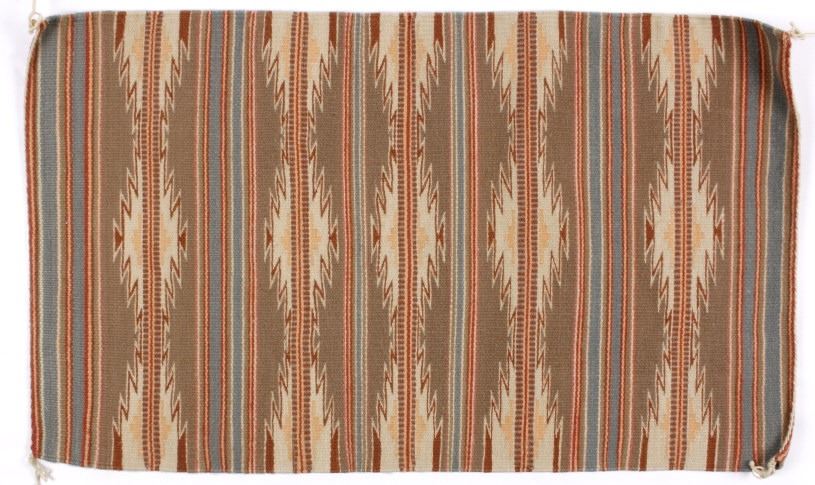 Featured for bidding in this lot is a Navajo Native American Indian wool rug, custom weaved in the Chinle pattern by Susie Smallcanyon. The rug shows typical Chinle design, with multiple repeating bands placed horizontally across the piece. Every other line on the rug shows traditional Chinle stars weaved into a band, with railroad track, alternating colors striking through the center. The rug shows a soft pastel color pallet, with a predominantly tan background, and showcasing wonderful accents of off-white, pink, robin egg blue, and more! Overall, the rug shows very good condition, and originates from the early part of the mid 1900's. The rug measures 33 1/2" x 20".