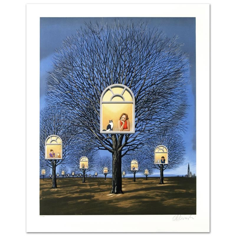 "Suspended Promises" is a limited edition hand pulled original lithograph on museum quality deckle edge paper, numbered and hand signed by Rafal Olbinski. Includes Letter of Authenticity. Measures approx. 26.5" x 33" (with border), 22.5" x 28.5" (image).