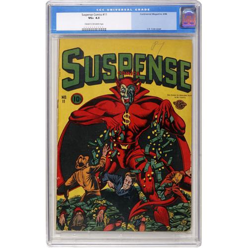 <B>Suspense Comics #11 (Continental Magazines, 1946) CGC VG+ 4.5 Cream to off-white pages.</B></I> Overstreet cites this "classic" L. B. Cole devil cover, and we heartily concur! That the issue is a Gerber "scarce" just adds to the desirability of this book, the value of which has been on the rise. Overstreet 2006 VG 4.0 value = $606. CGC census 3/07: 1 in 4.5, 12 higher.<BR><BR><b>Shipping:</b> Comics - Slabbed (certified) (<a target="_blank" href="http://www.heritageauctions.com/common/shipping.php">view shipping information</a>)