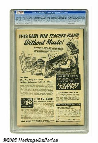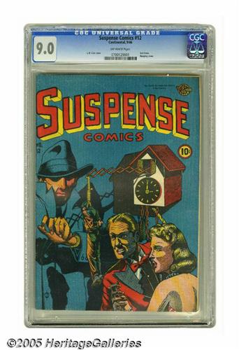 <B>Suspense Comics #12 (Continental Magazines, 1946) CGC VF/NM 9.0 Off-white pages.</B></I> Here's the highest-graded copy certified to date of this Gerber "8." This final issue of the title is graced by an L. B. Cole cover featuring Mr. Nobody. Inside the book, there's a <I>Madame</B></I> Nobody tale as well! Overstreet 2005 VF/NM 9.0 value = $1,591; NM- 9.2 value = $2,150. CGC census 2/05: 1 in 9.0, none higher.