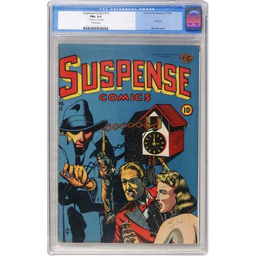 <B>Suspense Comics #12 (Continental Magazines, 1946) CGC FN+ 6.5 Cream pages.</B></I> As is so often the case, the last issue is one of the scarcest in the run, and for this title, that's quite a statement! It's a Gerber "8", or "rare" if you're not numerically inclined. We've offered this issue on only two previous occasions in the past five years. The L. B. Cole cover is fantastic. CGC notes, "3 inch crease on first 5 pages." Overstreet 2006 FN 6.0 value = $489; VF 8.0 value = $1,019. CGC census 3/07: 1 in 6.5, 4 higher.<BR><BR><b>Shipping:</b> Comics - Slabbed (certified) (<a target="_blank" href="http://www.heritageauctions.com/common/shipping.php">view shipping information</a>)