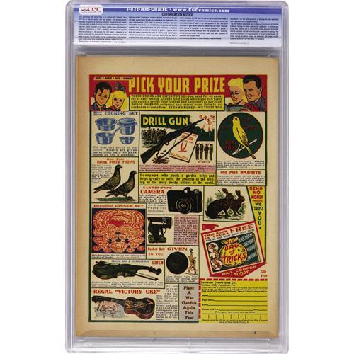 <B>Suspense Comics #2 Davis Crippen ("D" Copy) pedigree (Continental Magazines, 1944) CGC NM- 9.2 Off-white pages.</B></I> Only Edgar Church's Mile High copy has received a higher grade than this one to date, and with no other copies certified above 6.0, this is a chance not to be missed to get this issue of the horror/mystery series. Nina Albright drew the issue's cover, and L. B. Cole added seven pages of interior art. Overstreet 2006 NM- 9.2 value = $3,800. CGC census 6/06: 1 in 9.2, 1 higher. <I>From the Crippen Collection.</B></I> <BR><BR><B>Important notice:</B> Heritage usually auctions material at the rate of 200-250 lots per hour. On some occasions eBay Live bid software or the Internet may not be able to keep up with the pace of the auction. We recommend placing a realistic absentee bid now as insurance to avoid disappointment. Occasionally the auctioneer may eliminate or reject an eBay Live bid, and the auctioneer may also reopen a lot after the close of the eBay live bidding (usually because we missed an audience bid), and may reject your bid even if it shows you as the winning bidder. By bidding via eBay Live, you agree that Heritage may award the lot to another bidder at its sole discretion under the circumstances described above or any other reasonable circumstances. Since eBay bids are not shown to us until we open the lot on the floor, we treat those bids just like floor bids. In most cases the floor responds before the eBay bid is presented to us, due to Internet lag time, so for consistency we have made it a policy that floor bids are always considered first over tie eBay live bids. Also please note that all Heritage lots purchased through eBay Live carry a 22.5% Buyer's Premium. Please make sure you read the Terms and Conditions before you bid. This lot is being auctioned in conjunction with a live floor auction by Heritage Auction Galleries. All final auction and invoice information will be supplied by Heritage Auction Galleries, and all other information should be considered preliminary. Lot:41001 <BR><BR><B>Winning Notification and Billing:</B> After the FINAL session in this auction is complete, Heritage will send e-mail and snail mail invoices. This process normally takes several days. All final auction and invoice information will be supplied by Heritage Auction Galleries, and all other information should be considered preliminary. <BR><BR>This auction will be conducted on a live auction floor and over the Internet through eBay Live. If you choose to place an absentee bid, please take a moment to <font color='#0000ff'><u><a href='http://pages.ebay.com/liveauctions/help/before/laabsentee.html'>learn how eBay Live absentee bidding works</a></u></font><font color='#000000'>