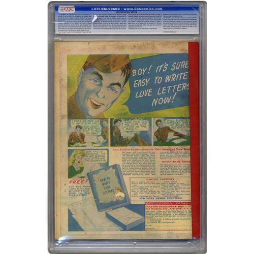 <B>Suspense Comics #3 (Continental Magazines, 1944) CGC FR/GD 1.5 Off-white to white pages.</B></I> This issue has been the object of frenzied collector interest ever since its Alex Schomburg bondage cover was featured on the frontispiece of Gerber's <B>Photo-Journal</B></I>. Most who proceeded to hunt for the comic came up empty -- this is a Gerber "9", or "very rare," and called "scarce" by Overstreet, all for good reason. And while finding one at all is tough enough, another hurdle is that many of the copies out there are incomplete, with the centerfold story "83 Days On A Life-Raft" often missing due to the unorthodox binding process used by this publisher. We breathed a hearty sigh of relief when we paged through this copy and found the "Life-Raft" story present and accounted for. The other interior story of note is a 7-pager by the highly collectible L. B. Cole. This issue is ranked among the 100 most valuable Golden Age comics by Overstreet, and takes a back seat to very few in terms of collector excitement. Don't miss out on this copy of a Schomburg classic! CGC notes, "1 large piece of tape on spine of cover & 1 large piece of tape on spine of interior cover." Overstreet 2006 GD 2.0 value = $2,000. CGC census 4/06: 1 in 1.5, 7 higher.
