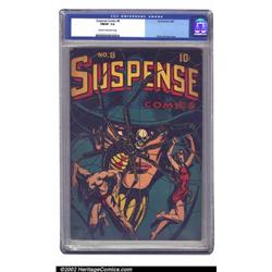 Suspense Comics #8 (Continental Magazines, 1945) CGC FN/VF 7.0 Cream to off-white pages. Heads up, L. B. Cole fans...here is yet another classic cover from the master himself. This spider cover has received a lot of notoriety over the years, and has even been featured as the cover of an issue of Comicbook Marketplace. Second only to Suspense Comics #3 in terms of desirability and value, this comic rarely turns up for sale...and seldom stays for sale for very long. Overstreet 2002 FN 6.0 value = $1,200; VF 8.0 value = $2,500. Important notice: We expect to be auctioning lots at the rate of 200-250 per hour. Sometimes eBay Premier live bid software cannot keep up with that pace, so we strongly recommend that you place a realistic proxy bid now as insurance to avoid disappointment. Also please note that all Heritage/CAA lots purchased through eBay Premier carry a 20% Buyer's Premium. Please make sure you read the Terms and Conditions.