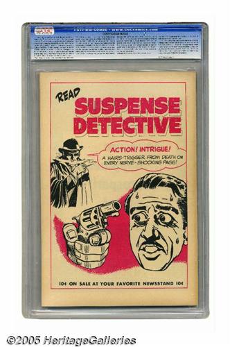 <B>Suspense Detective #5 Crowley Copy pedigree (Fawcett, 1953) CGC NM 9.4 Off-white pages.</B></I> Highest-graded copy by CGC to date of #5. Mike Sekowsky cover, with Sekowsky, Bernard Baily, and Alex Toth interior art. Overstreet 2005 NM- 9.2 value = $255. CGC census 5/05: 1 in 9.4, none higher.