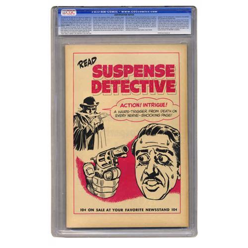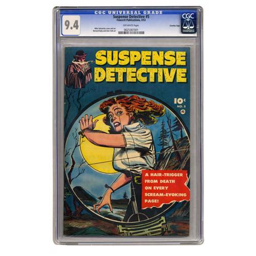 <B>Suspense Detective #5 Crowley Copy pedigree (Fawcett, 1953) CGC NM 9.4 Off-white pages.</B></I> Highest-graded copy by CGC to date of #5. Mike Sekowsky cover, with Sekowsky, Bernard Baily, and Alex Toth interior art. Overstreet 2005 NM- 9.2 value = $255. CGC census 12/05: 1 in 9.4, none higher.