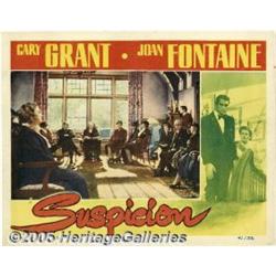 <B>Suspicion (RKO, 1941)</B></I> Lobby Cards (2) (11" X 14"). Joan Fontaine received the Best Actress Award for her portrayal of Lina McLaidlow, the suspicious new wife of Cary Grant. Director Alfred Hitchcock originally scripted the end with proof that the husband was indeed guilty of murder. RKO, fearing that such an ominous conclusion would harm the reputation of their star, Mr. Grant, forced Mr. Hitchcock to include a happier finale. Offered in this lot are two lobby cards from this set, each featuring Grant and Fontaine. There is light soiling and faint smudge marks on the borders and some trivial edge wear, otherwise these cards are in wonderful condition. Very Fine+. 2 items