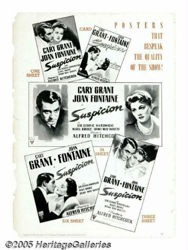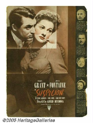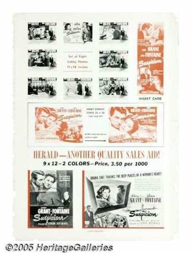 <B>Suspicion (RKO, 1941).</B></I> Pressbook (Multiple Pages). In another performance as a newlywed, Joan Fontaine earned an Oscar for her role as a woman who suspects that her too-good-to-be-true husband may actually be a murderer. Cary Grant, as the husband and suspected murderer, was destined to become one of Alfred Hitchcock's favorite performers. The spine of the cover has separated, there is edge wear with small tears and chips and the pages have slightly toned. Good/Very Good.