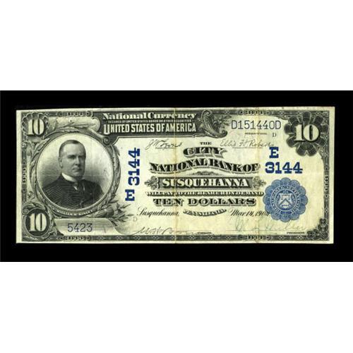 <B>Susquehanna, PA</B></I> - $10 1902 Plain Back Fr. 624 <B>The City NB</B></I> Ch. # (E)3144<BR> This is a very scarce bank in large size, with just seven pieces making up the entire census. This example is new to that listing. <B>Very Fine.</B></I><BR><BR><b>Shipping:</b> Coins & Currency (<a target="_blank" href="http://www.heritageauctions.com/common/shipping.php">view shipping information</a>)