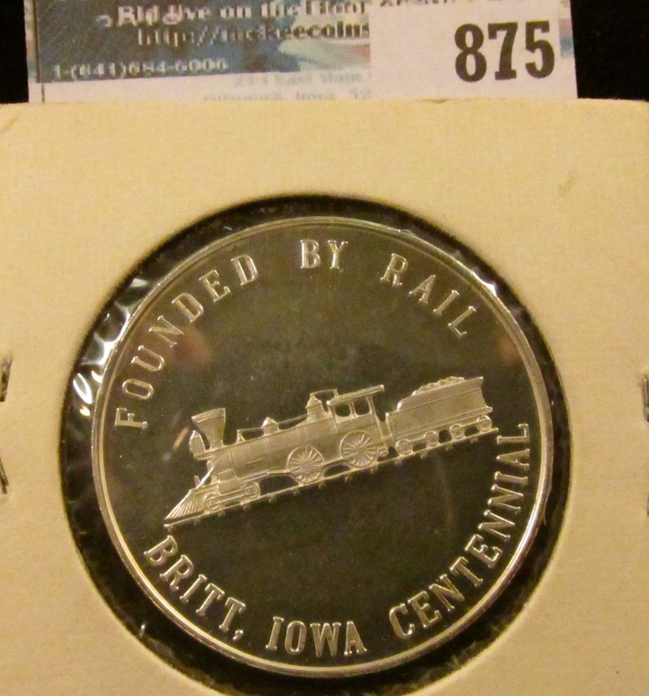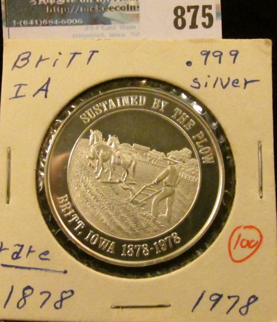 "Sustained by the Plow/Britt, Iowa1878-1978", "Founded by Rail/Britt, Iowa Centennial", Proof, .999 Fine Silver.