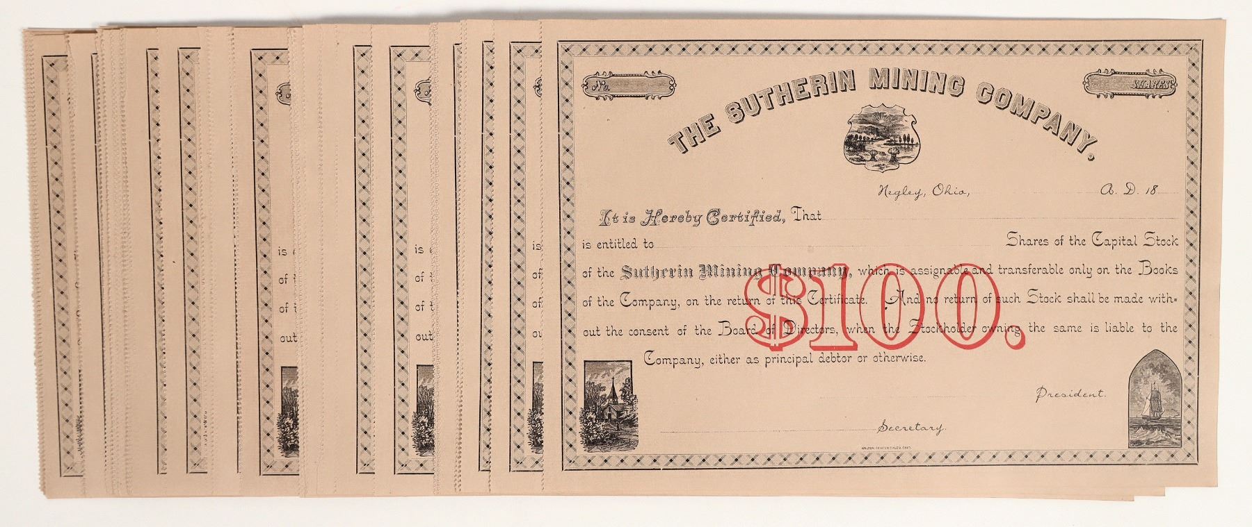 About 80 Sutherin Mining Company Stocks, Unissued. Datelined Negley, Ohio 18__. See photos.