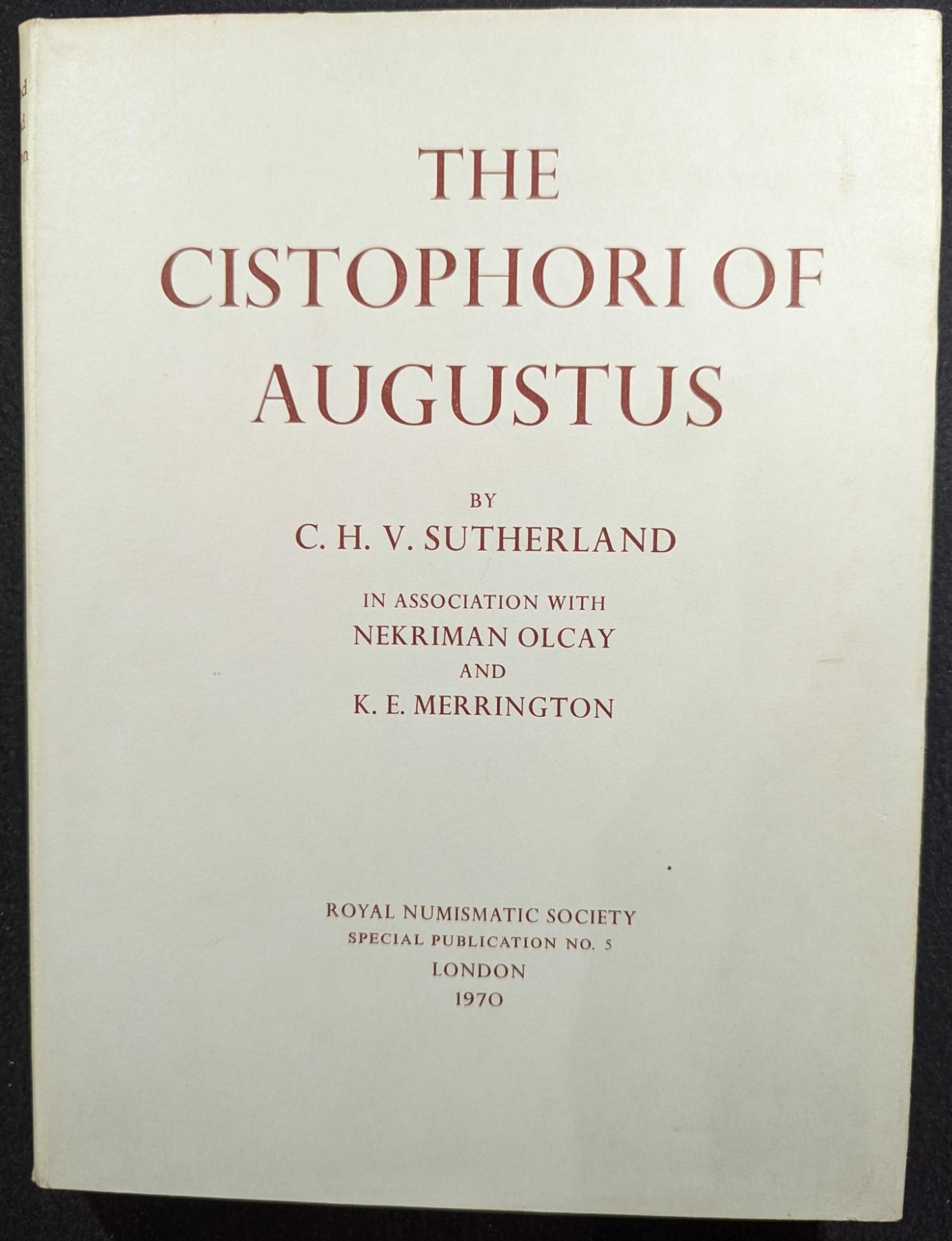 Sutherland, C.H.V. & Nekriman Olcay & K.E. Merrington. THE CISTOPHORI OF AUGUSTUS. Royal Numismatic Society. 1970. 4to. 134 pages. Original red cloth, gilt. dust jacket. 36 plates. Fine. Royal Numismatic Society, Special Publication No. 5. Standard reference, corpus and die-study of the large silver coins struck in the Eastern mints with Latin legends. Clain-Stefanelli 2612. Grierson 82. Kroh 5 stars. Lot weight: 1 lbs 13oz. Subject(s): Ancient Coinage.