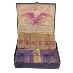Sutherlands Eagle Eye Salve display box w/7 full boxes of original product, box is cdbd. w/paper labels, c.1880, Good condition, 6" Square.