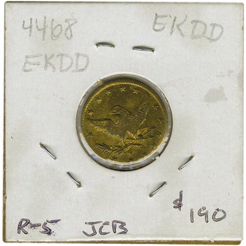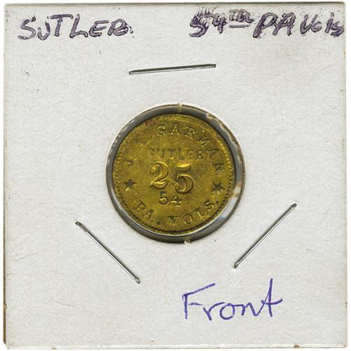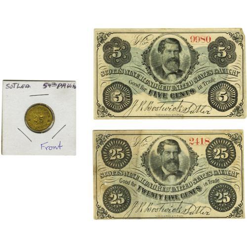 <B>Sutler Lot Including Two Sutler "Chits" from the famous "Scotts Nine Hundred United States Cavalry".</B></I> A 5-cent in excellent shape and a 25-cent with one small hole and some staining. Also, a beautiful 5-cent "T.A. Garman Sutler, 54 PA. Vols." brass token with eagle on reverse in excellent - average condition.<BR><BR><b>Shipping:</b> Small Flat (<a target="_blank" href="http://www.heritageauctions.com/common/shipping.php">view shipping information</a>)
