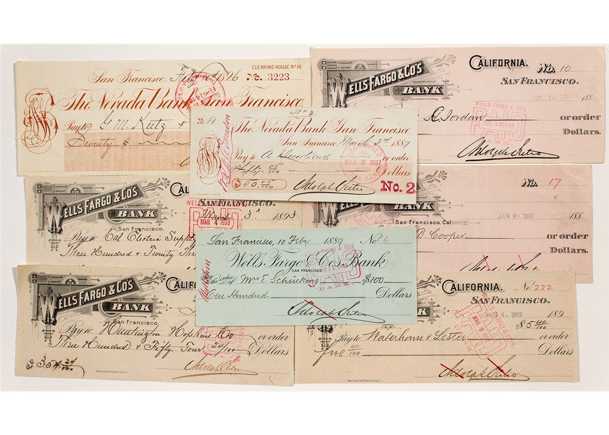 c1887 Lot of 8: Mix of Wells Fargo & Co's Bank and the Nevada Bank of San Francisco checks, all signed by the famous Adolph Sutro. Sutro (1830-1898) made his fame on the Comstock as the man behind the major tunnel enterprise that was to remove the water from the deep mine shafts, then sold the company, became a millionaire, moved back to San Francisco, and became its mayor. - HKA#65168