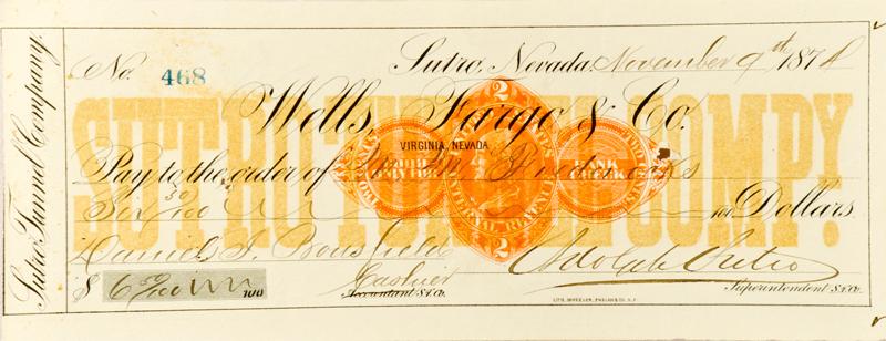Sutro,NV - Lyon County - 1874 - Sutro, Adolph Personal Check Adolph Sutro Check :