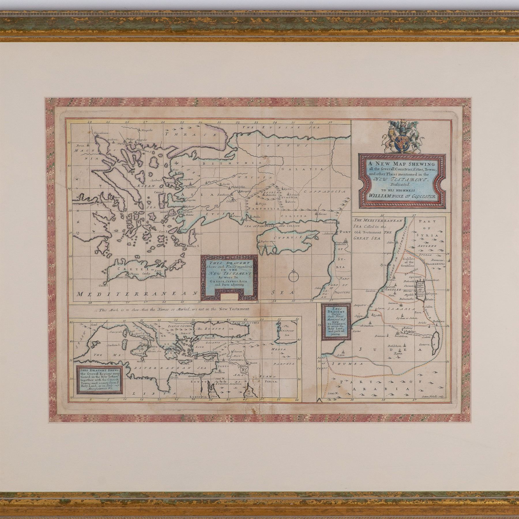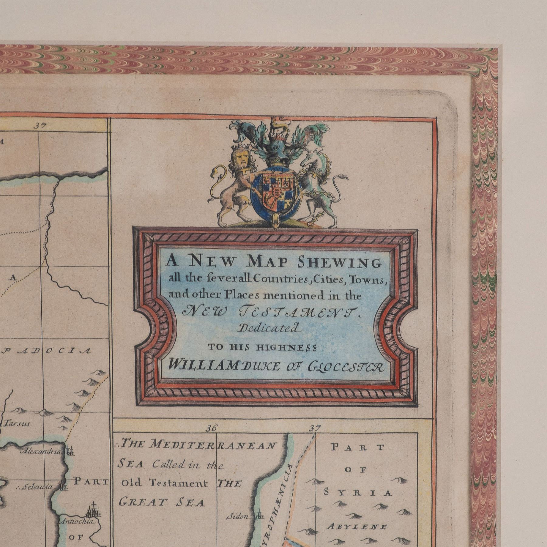 An antique hand-colored map titled A New Map Shewing all the several Countries, Cities, Towns, and other Places mentioned in the New Testament, dedicated to His Highness William, Duke of Gloucester. This beautifully detailed map depicts the geographic locations mentioned in the New Testament, including notable areas around the Mediterranean, the Holy Land, and parts of Syria. The upper cartouche, featuring a crest with the royal arms, enhances its historical significance. It is professionally framed with a gilt wooden border and marbled matting, adding to its presentation value. Sight size: 19.75"L x 15"H. Frame dimensions: 29.50"L x 25"H x 1.50"W. Artwork can be unframed and rolled for shipment.