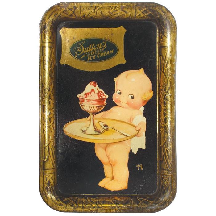 Sutton's Sweet Cream Ice Cream kewpie tray, VG cond w/paint wear & pitting, 17.5"H x 11.25"W.