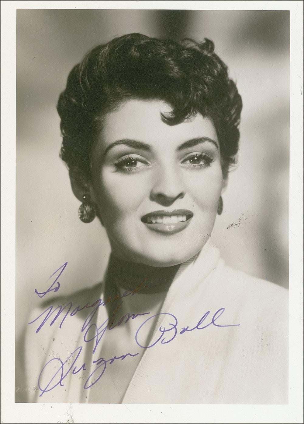 A second cousin of Lucille Ball, Suzan Ball (1934–1955) embarked on a promising Hollywood career with appearances in several adventure films in the early 1950s. Though she was diagnosed with cancer in 1953 and lost her leg to amputation, Ball went on to marry actor Richard Long and to resume her career. She finally succumbed at the age of 21. Vintage matte-finish 5 x 7 photo, signed and inscribed in ink “To Marilyn from Suzan Ball.” In fine condition, with some scattered light soiling and ink marks.