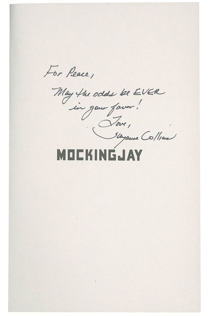 Signed book: Mockingjay. First edition, later printing. NY: Scholastic Press, 2010. Hardcover with dustjacket, 6 x 8.5, 390 pages. Signed in-person on the half-title page in black felt tip, “For Peace, May the odds be ever in your favor! Suzanne Collins.” In fine condition, with a couple of creases to the front flap of the dustjacket.