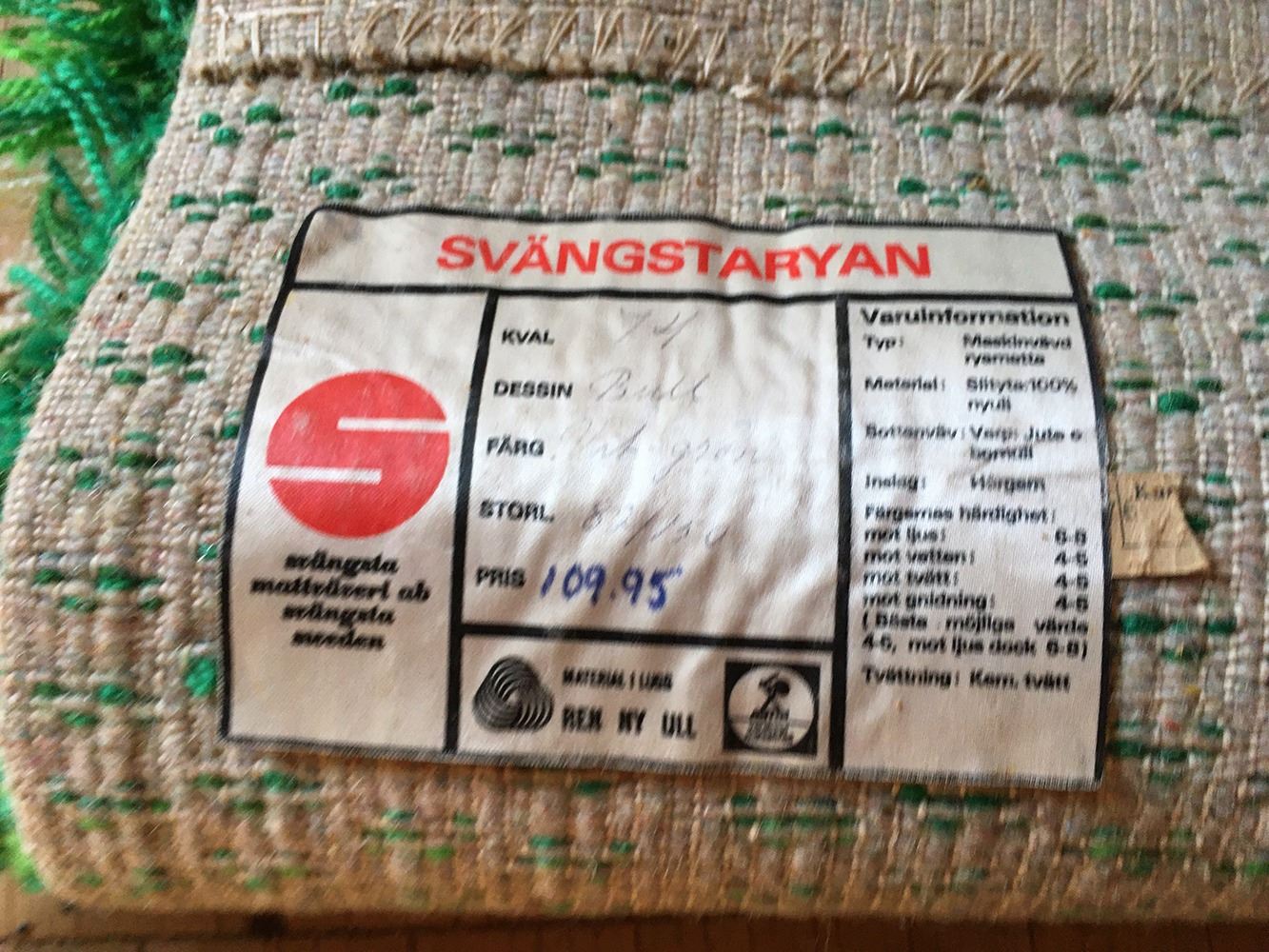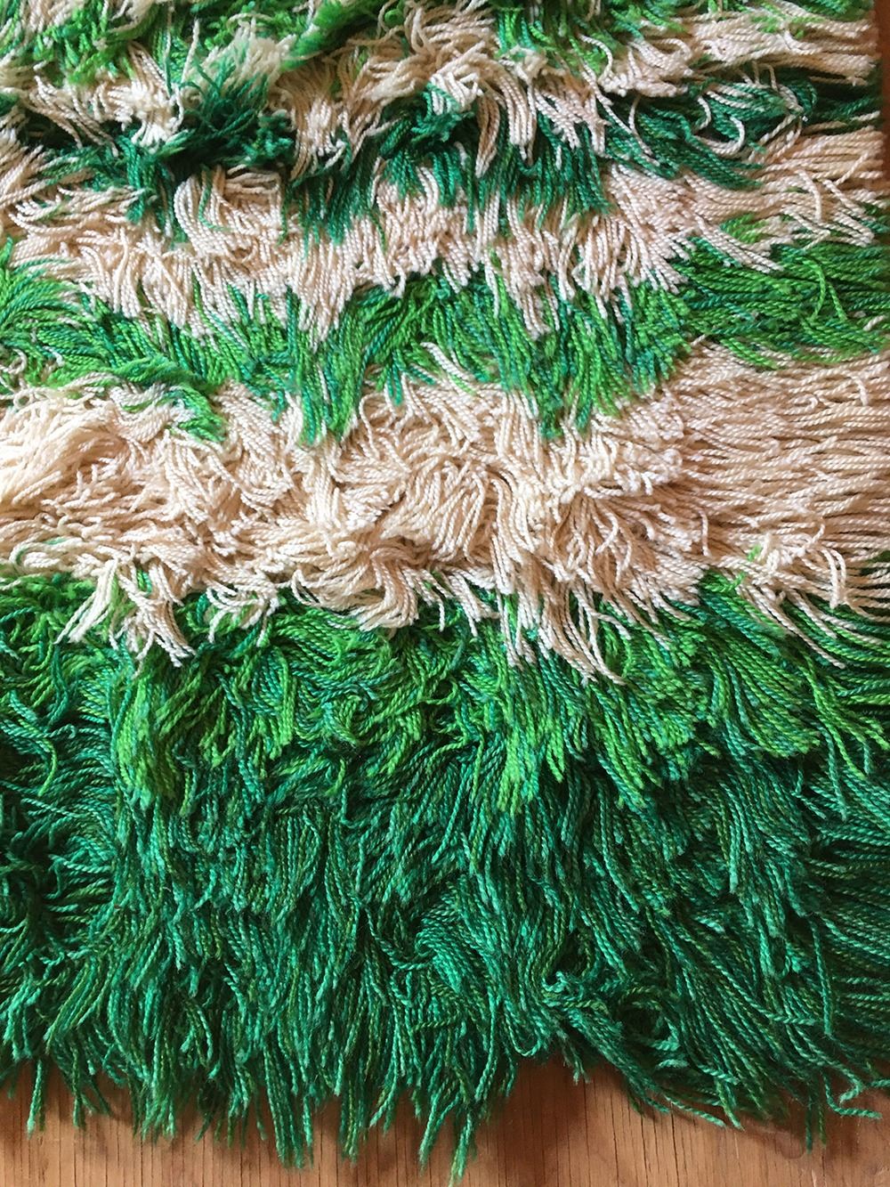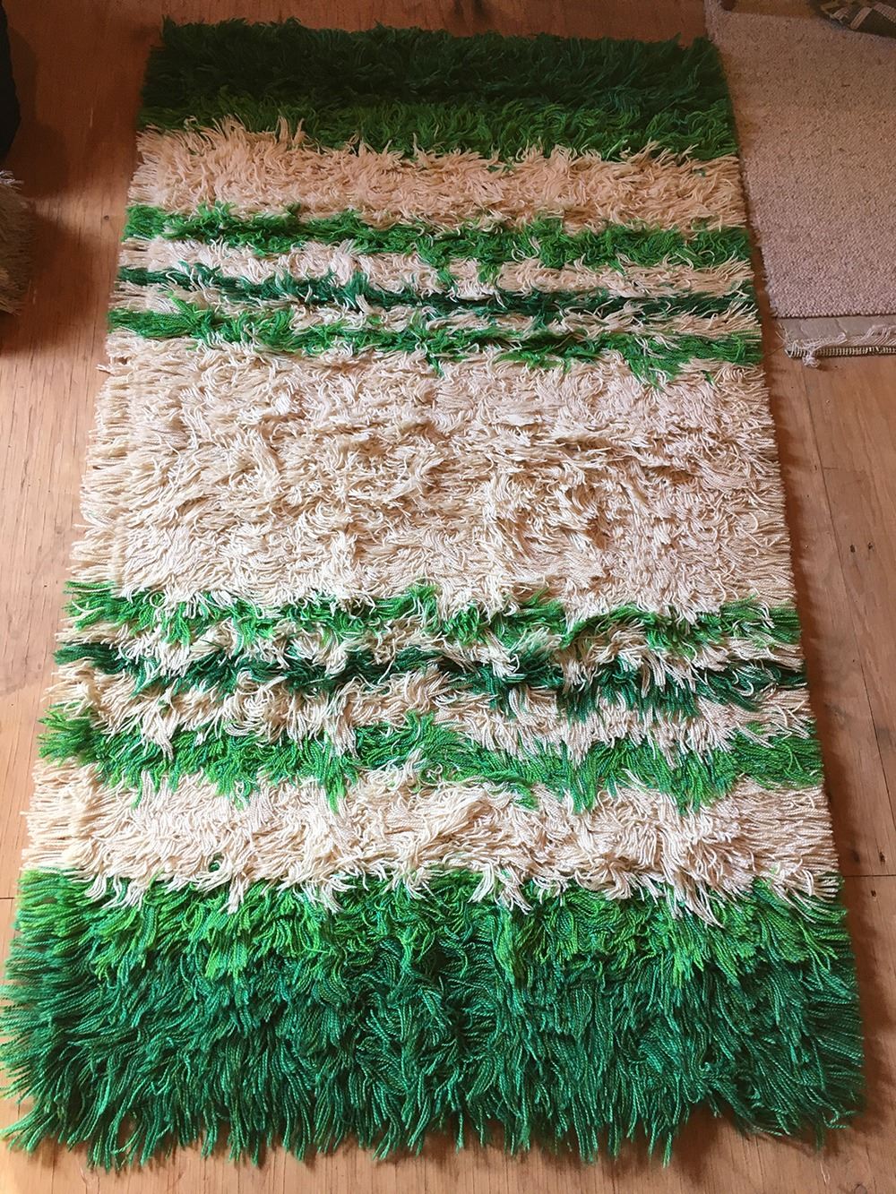 Svangstaryan vintage Mid-Century Modern Swedish linen shag rug, green and white, measures approx. 34 inches x 61 inches.