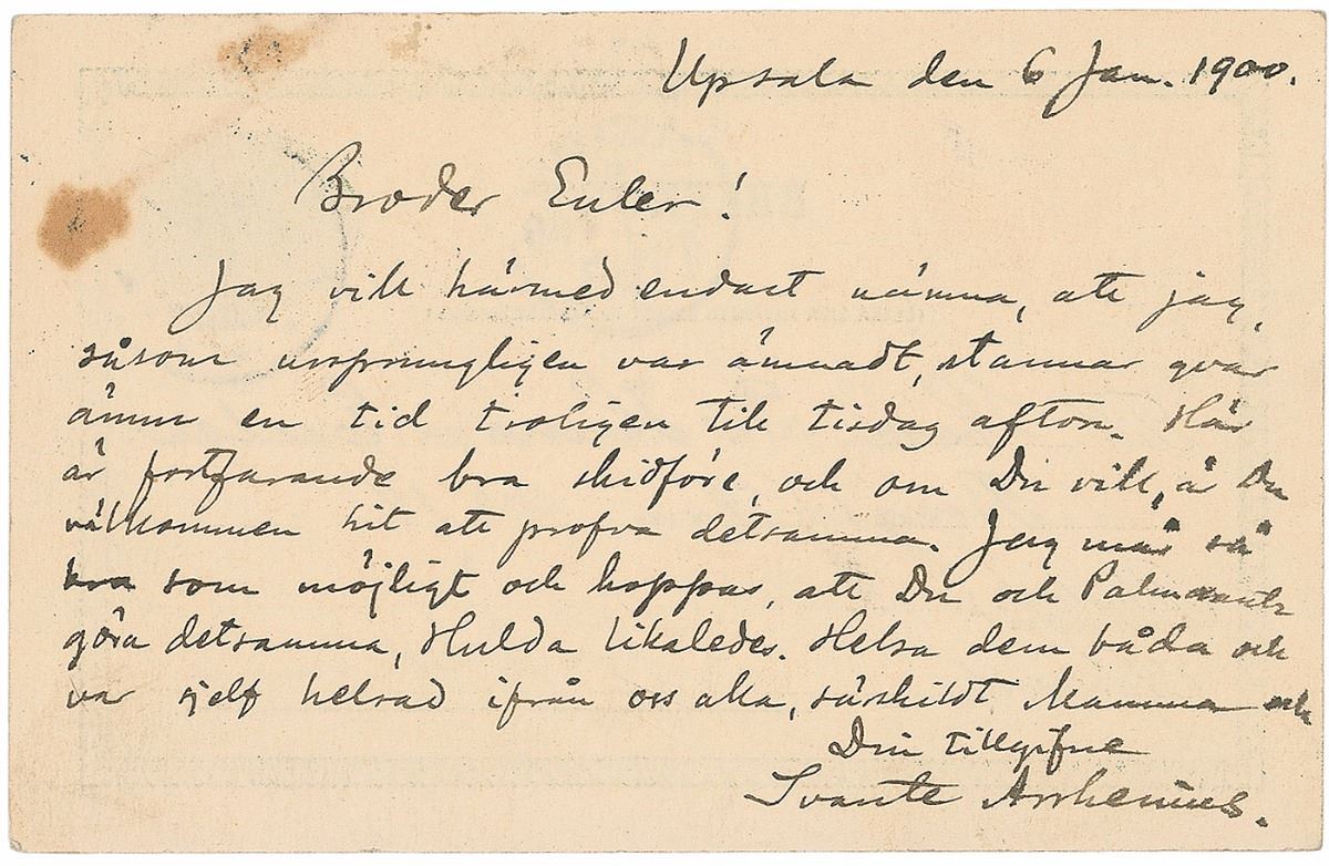 Influential Swedish scientist (1859–1927) who received the Nobel Prize for Chemistry in 1903 in recognition of his theory of electrolytic dissociation. ALS in Swedish, one page, 5.5 x 3.5, January 6, 1900. Untranslated letter to chemist and Nobel laureate Hans von Euler-Chelpin. Staining to upper left, otherwise fine condition. A nice association between esteemed scientists.