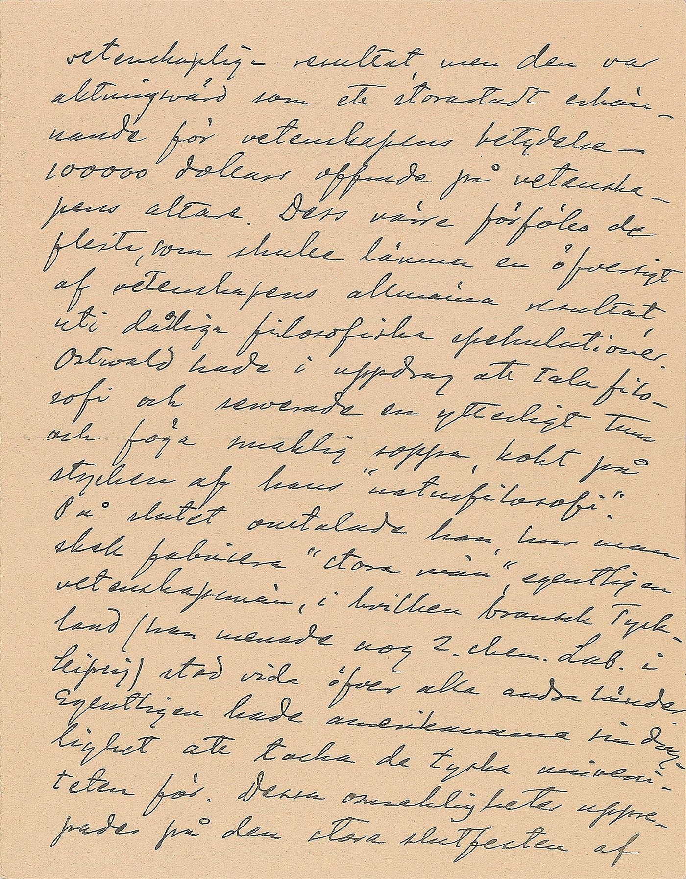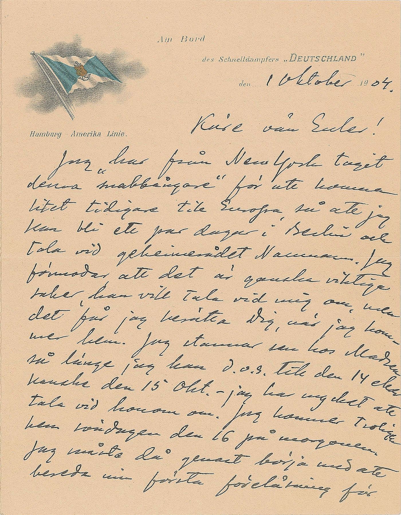 ALS in Swedish, four pages on two adjoining sheets, 5.5 x 7.25, Hamburg-America Line letterhead, October 1, 1904. Letter to his assistant Hans von Euler-Chelpin, who would go on to win the 1929 Nobel Prize in Chemistry. Arrhenius describes his experience at the International Congress of Arts and Science in St. Louis, and details his scientific plans as soon as he will return to Europe. In fine condition.