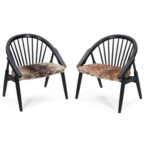 Sveinn Kjarval lounge chairs, pair, by Ny-Virki, iceland, ebonized wood frames with original fur-covered seats, both marked with a paper label, original finish,23.5in.w x 21in.d x 27in.h,very good condition
